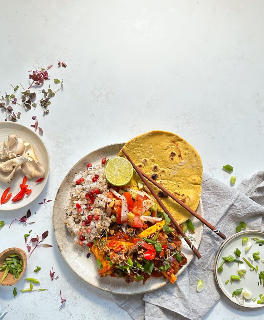 The repeated use of circles - the plates, the lime and the flatbread create harmony.